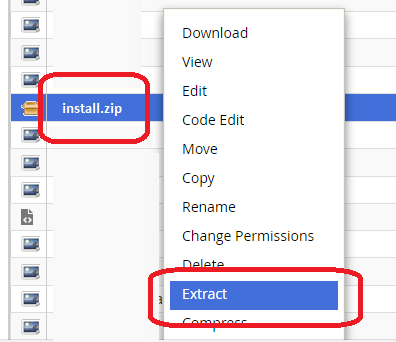 * Once the upload is finished go back to your file manager and right click on the install.zip file that you uploaded and then on Extract.